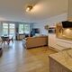 Die große im Wohnraum integrierte Küche hat einen Ofen mit Mikrowellenfunktion, Zerankochfeld, Wasserkocher, Kaffeemaschine, Toster und Spülmaschine.