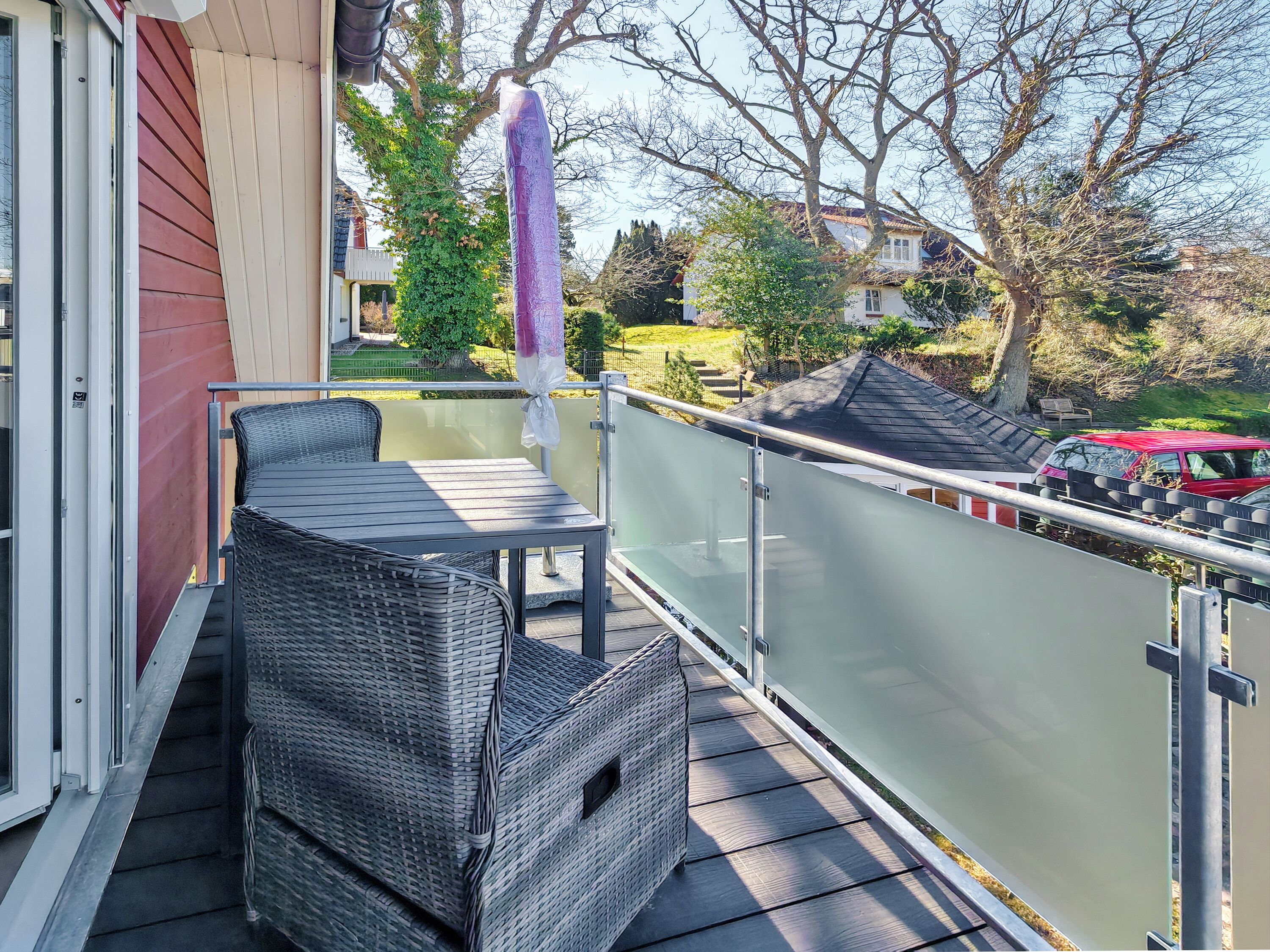 Die Wohnung verfügt über einen Balkon mit Balkonmöbeln.