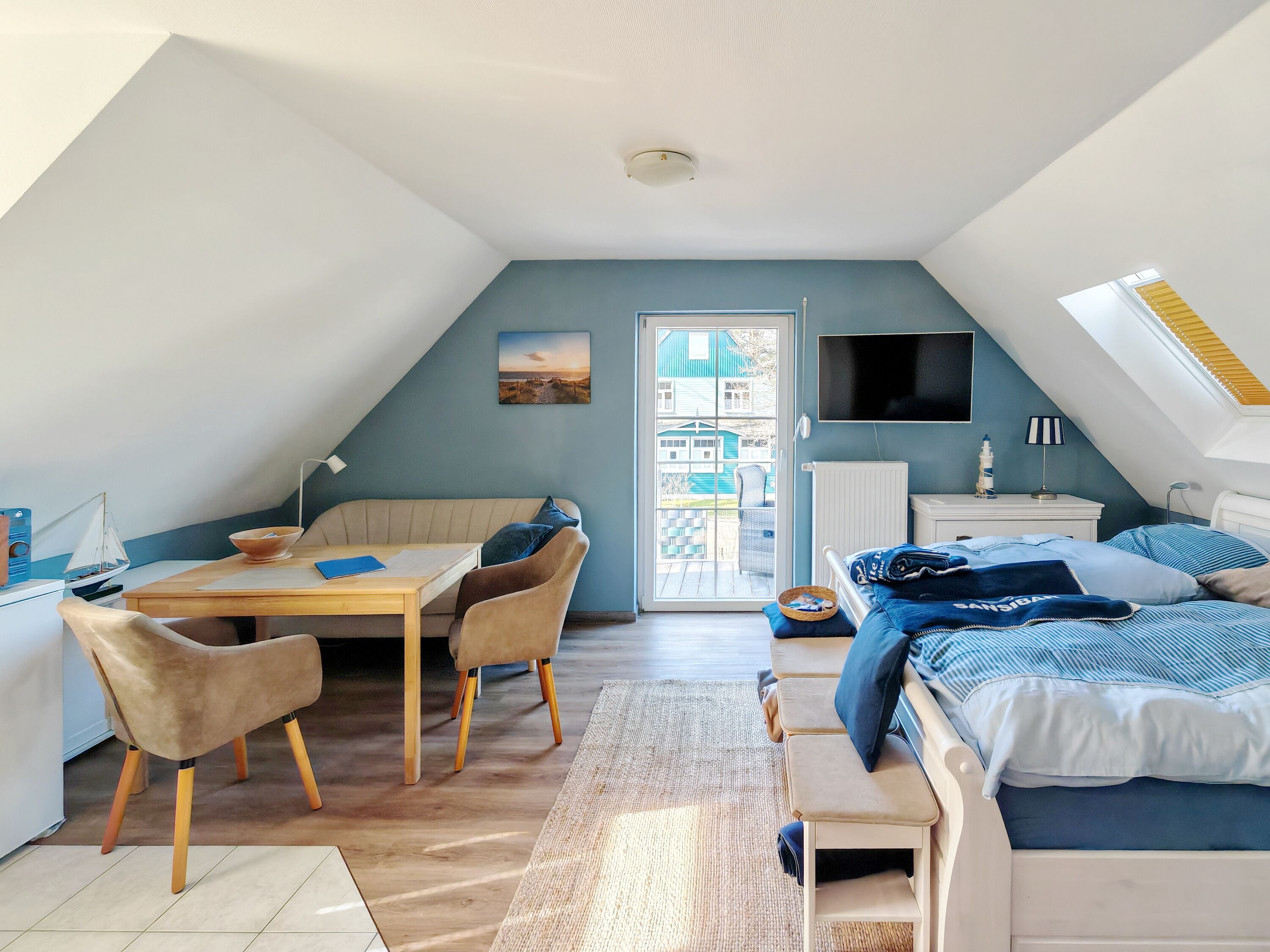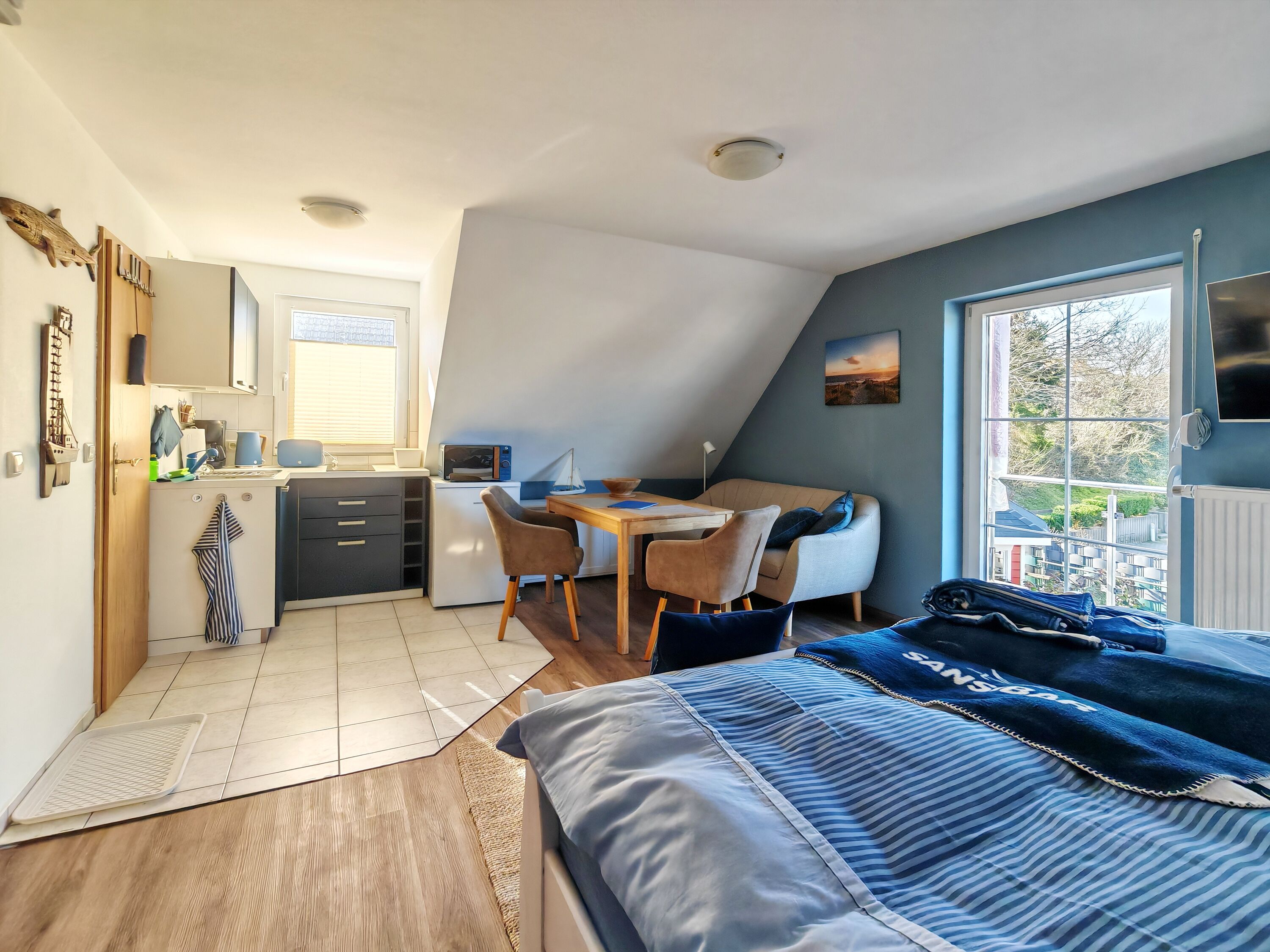 Es ist alles in einem maritimen Stiel geschmackvoll aufeinander abgestimmt. Im kombinierten Wohn-und Schlafraum mit TV, befindet sich auch eine gut ausgestattete kleine Küche.